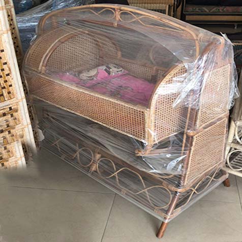 עריסה לתינוק קליעה וינאית – שלד עריסת התינוק בנוי מבמבוק טבעי מלא וחזק דפנות העריסה בקליעה וינאית. העריסה בנויה מ-2 חלקים אשר ניתנים להפרדה: חלקה העליון מתנדנד בפני עצמו ומתחתיו מדף לאחסון העריסה כוללת מזרן ספוגי ומרופד בעובי 10 ס"מ. העריסה מיוצרת בהזמנה לפי בחירתך, בעבודת יד ואהבה בקשקלוע.